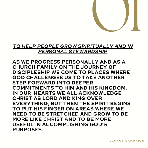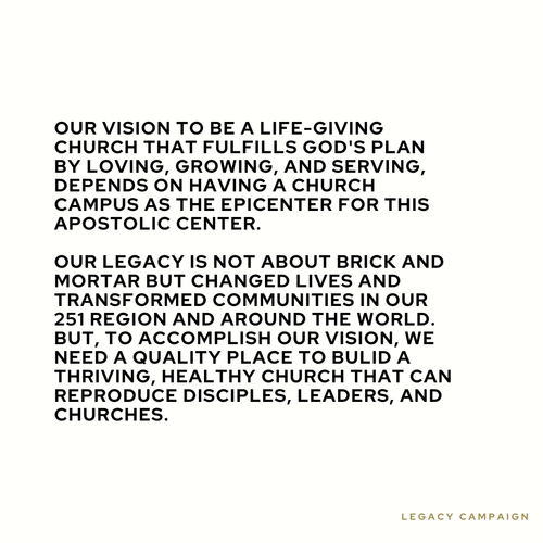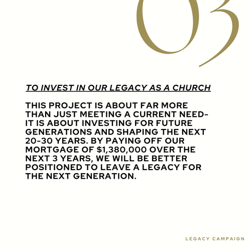 That's why we have adopted the idea of Legacy: Faith, Family and Future to brand this Stewardship Campaign. It's not just about raising money, although reaching financial goals will make many other things possible. This campaign is about stretching to reach a God-given dream.